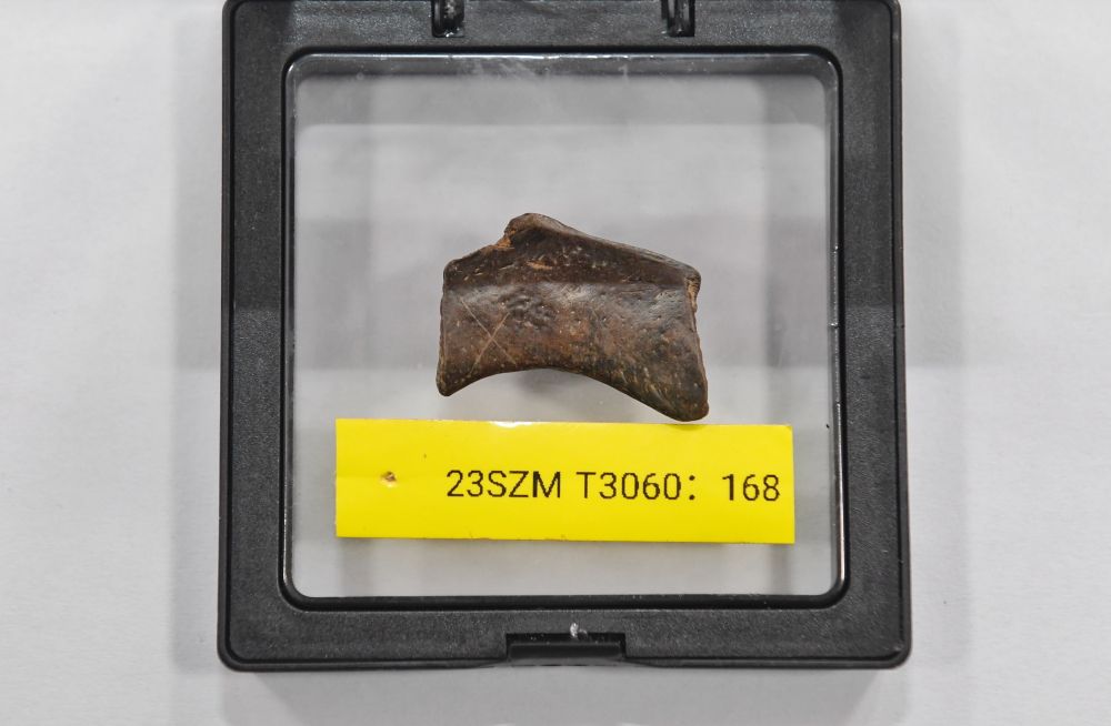 2023年12月5日拍攝的從四川資陽濛溪河遺址群出土的有X形劃痕的骨器。該遺址是國際罕見的同時包含豐富石器、動物與植物遺存的“全科型”遺址,入選了“2024年度全國十大考古新發現”。