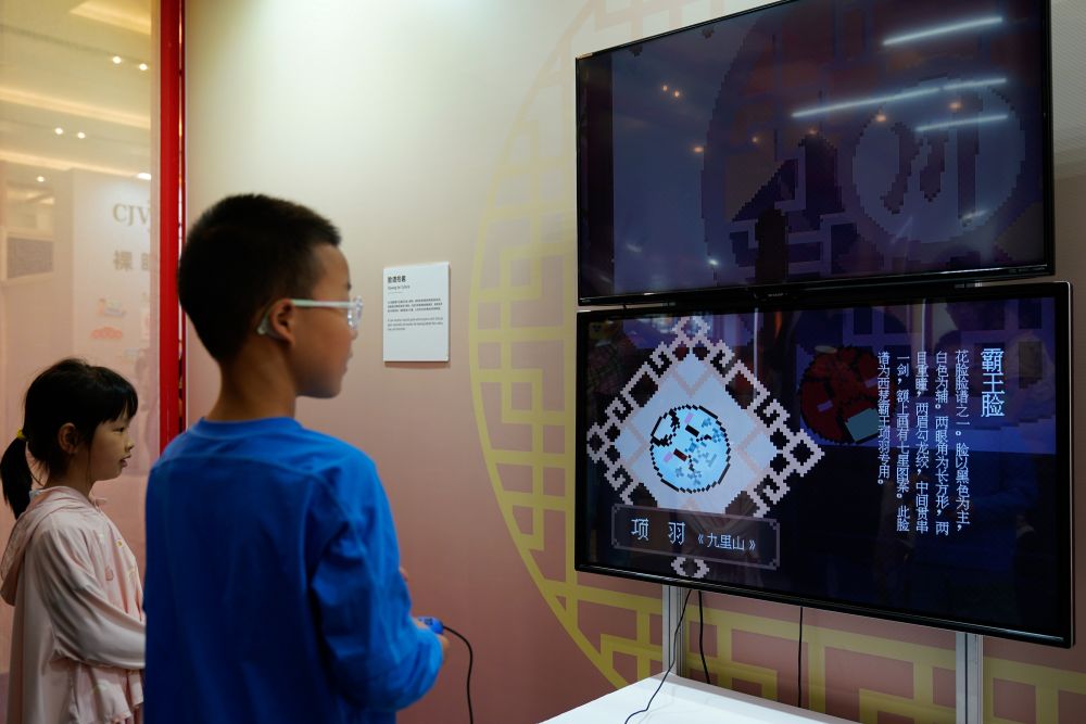 2025年5月31日,在第九屆中國成都國際非物質文化遺產節上,小朋友通過互動游戲了解川劇臉譜。