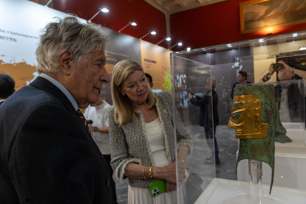 2025年5月13日,觀眾在希臘雅典新斯米爾尼市政博物館參觀“青銅之光——古蜀文明特展”。展覽通過精美的文物復制品、3D打印技術和圖文展示,生動呈現以三星堆—金沙遺址為代表的古蜀文明,吸引眾多當地民眾前來參觀。
